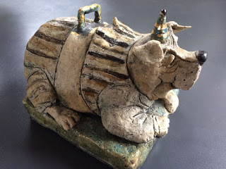 Baasjes gaan vaak op hun hond lijken. Dat is zijn baasje helaas nog niet gelukt.Hij ziet af en toe met genoegen op de televisie leden van het Engelse Hogerhuis met recht House of Lords genoemd.Dat zijn mooie hondenkoppen.Prachtige hangwangen, intelligente diepe rimpels in het voorhoofd, een indrukwekkende paarse mopsneus en fraaie zware oogleden die als draperieën de waterige ogen omlijsten. En ze kunnen kwijlen als geen ander.Mooie koppen en hij heeft wel eens horen zeggen dat zo’n kop een plethorisch gelaat heet. Wat dat is weet hij niet goed maar het klinkt voornaam en dat past.Wat hij ook zo aangenaam van die Engelse Lords vindt is dat zij ‘only show emotions to horses and dogs’. Ook daar kan zijn baasje nog wat van leren.Die showt zijn emoties aan het bazinnetje en de kinderbaasjes en zet hem een feestmuts op. Dat doe je toch niet bij een hond van zijn statuur.‘Not my cup of tea’ denkt hij en schikt zich als trouwe hond in zijn lot.Hij zucht van misnoegen, recht zijn schouders even maar zijn blik blijft onverstoorbaar .Noblesse oblige, adel verplicht.
